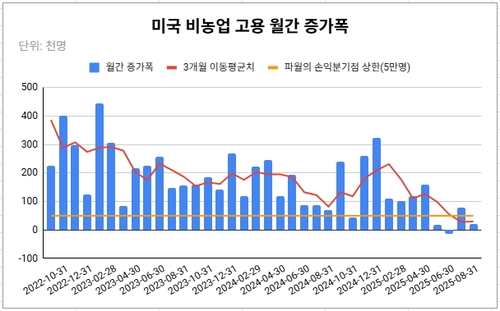 파월 의장은 17일(현지시간) 연방공개시장위원회(FOMC) 기자회견에서 비농업 고용의 '손익분기점'(breakeven)이 얼마냐는 질문에 측정 방법이 많으며 어떤 것도 완벽하지 않다는 전제를 내세운 뒤 "분명히 크게 낮아졌다. 제로(0)에서 5만명 사이 어딘가라고 말할 수 있다"고 답했다. 그는 이어 "맞을 수도 있고 틀릴 수 있다"며 재차 신중한 태도를 보였다.