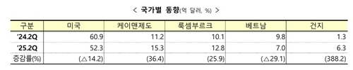 국가별로 살펴보면 케이맨제도(36.4%), 룩셈부르크(25.9%) 등에선 직접투자가 증가했으나, 베트남은 전년 대비 29.1% 줄어든 7억달러에 그쳤다.