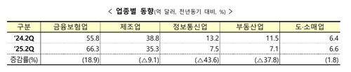 금융보험업은 전년 대비 18.9% 증가했으나, 나머지 제조업(-9.1%), 정보통신업(-43.6%), 부동산업(-37.8%) 등은 모두 줄었다.