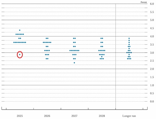 9월 FOMC 점도표에 따르면, 한 명의 참가자는 올해 말 금리 전망치를 두드러지게 낮은 2.875%로 제출했다. 이는 연내 두 번의 추가 인하를 의미하는 중간값(3.625%)을 75bp 밑도는 수준이다.