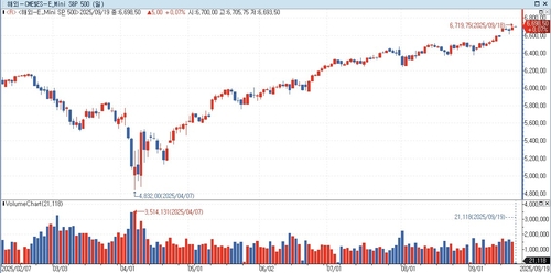 연합인포맥스 지수선물 통합화면(화면번호 6520)에 따르면 한국 시각으로 오전 10시38분 기준 E-미니 S&P500 지수 선물은 전장 대비 0.07% 오른 6,698.50에 거래됐다.