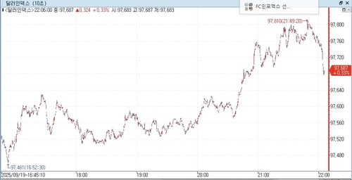 연합인포맥스(화면번호 6411)에 따르면 19일 오전 9시 7분께(이하 미 동부시간) 뉴욕 외환시장에서 주요 6개 통화에 대한 달러 가치를 반영하는 달러인덱스(DXY)는 97.694로 전장 마감 가격(96.374)보다 0.320포인트(0.329%) 상승했다.