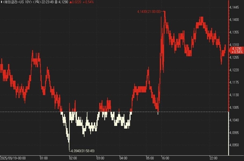 연합인포맥스의 해외금리 일중 화면(화면번호 6532)에 따르면 19일(미국 동부시간) 오전 9시 현재 뉴욕 채권시장에서 10년물 국채금리는 전 거래일 오후 3시 기준가보다 2.40bp 오른 4.129%를 기록했다.