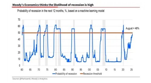 우선, 무디스가 개발한 경제 모델을 언급하며 해당 모델이 지난달 기준 경기침체 가능성을 48%로 제시하고 있다고 지적했다.