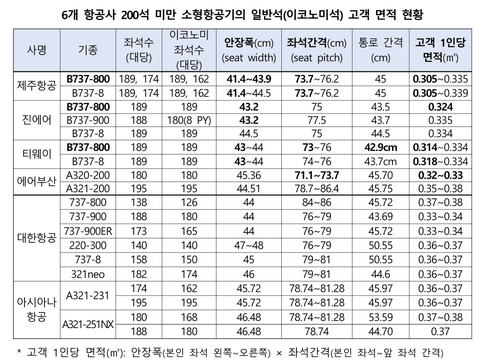 더불어민주당 정준호 의원실이 23일 국토교통부로부터 제출받은 '6개 항공사의 이코노미 좌석 현황' 자료에 따르면 제주항공 B737-800 기종 이코노미석의 안장폭은 최소 41.4㎝였고, 고객 1인당 면적도 최소 0.305㎡였다.
