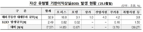 (서울=연합인포맥스) 윤슬기 기자 = 고금리와 정책 불확실성 등으로 국내 금융사가 투자한 해외 부동산 자산 중 2조4천900억원의 부실 가능성이 높은 것으로 나타났다.