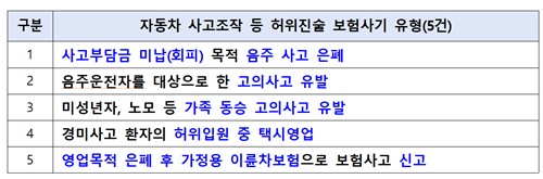 (서울=연합인포맥스) 이윤구 기자 = 음주운전 은폐와 입원 중 택시영업, 허위진술 등 사고내용 조작을 통한 자동차보험 허위 청구가 늘고 있다.