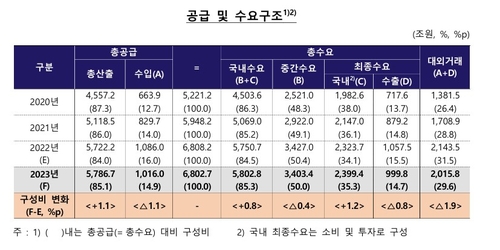 한국은행이 24일 공개한 '2023년 산업연관표'에 따르면 2023년 수출과 수입을 합한 대외거래가 총공급에서 차지하는 비중은 29.6%로 전년의 31.5%보다 1.9%포인트(p) 감소했다.