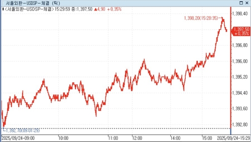 24일 서울 외환시장에서 달러-원 환율은 오후 3시 30분 기준 전장대비 4.90원 오른 1,397.50원을 기록했다.