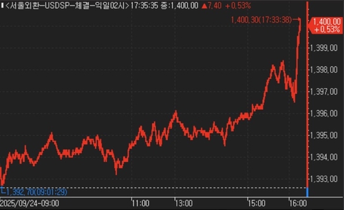24일 서울 외환시장에서 달러-원 환율은 오후 5시35분 현재 전일 대비 7.40원 오른 1,400.00원에 거래됐다.