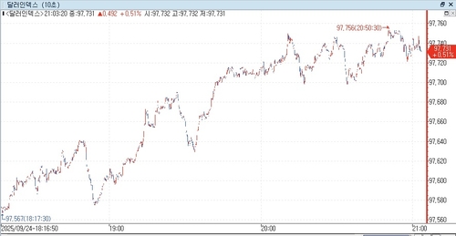 연합인포맥스(화면번호 6411)에 따르면 24일 오전 8시 2분께(이하 미 동부시간) 뉴욕 외환시장에서 주요 6개 통화에 대한 달러 가치를 반영하는 달러인덱스(DXY)는 97.735로 전장 마감 가격(97.225)보다 0.510포인트(0.494%) 상승했다.