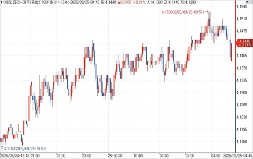 연합인포맥스의 해외금리 일중 화면(화면번호 6532)에 따르면 24일(미국 동부시간) 오후 3시 현재 뉴욕 채권시장에서 10년물 국채금리는 전 거래일 오후 3시 기준가 대비 2.70bp 오른 4.1470%에 거래됐다.