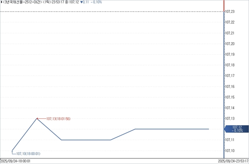 25일 서울채권시장에 따르면 3년 국채선물은 야간 거래에서 전일 주간 거래 종가 대비 3틱 하락한 107.12에 마감됐다. 외국인은 14계약 순매수했고, 개인과 금융투자는 각각 1계약 및 13계약 순매도했다.