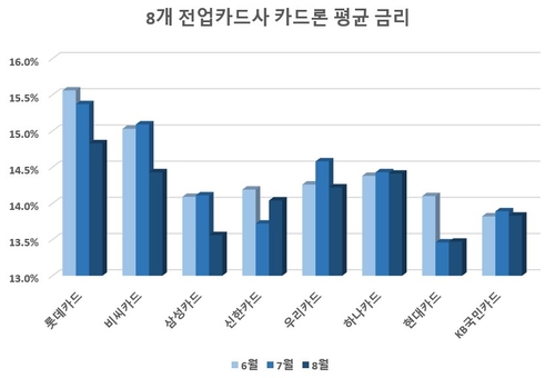 25일 여신금융협회에 따르면 8월 말 기준 8개 전업카드사(삼성·신한·KB국민·현대·롯데·하나·우리·비씨)의 메이저사이트 평균 금리는 14.10%로 전월(14.33%) 대비 0.23%포인트(p) 하락했다.