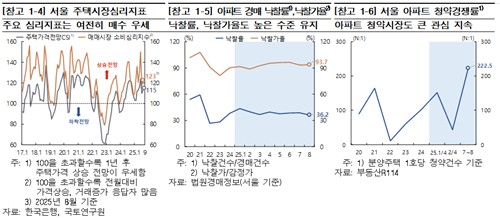8월 기준 아파트 경매 낙찰가율은 93.7%, 낙찰률은 36.2%로 모두 높은 수준을 유지하고 있다. 서울 아파트 청약경쟁률은 7~8월 중 222.5대 1을 기록하면서올해 2분기 43.7대 1에 비해 대폭 커졌는데, 이는 서울 아파트 청약에 큰 관심이 지속되고 있음을 시사하고 있다.