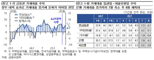금융권 가계대출은 7월중 2조3천억원 증가하며 전월(6조5천억원) 대비 증가 규모가 큰 폭 축소됐다가 8월에는 5~6월 늘어났던 주택거래분이 시차를 두고 대출 실행으로 이어지면서 4조7천억원 늘어나면서 다소 확대됐다.