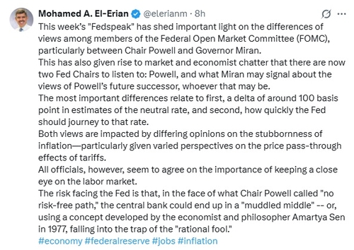 (서울=연합인포맥스) 김지연 기자 = 모하메드 엘 에리언 알리안츠그룹 경제 고문은 연방준비제도(연준·Fed)가 '합리적 바보'의 함정에 빠질 수 있다고 경고했다.