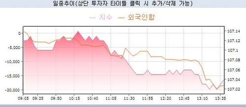 서울 채권시장에 따르면 3년 국채선물은 오후 1시38분 현재 전일 대비 12틱 내린 107.03을 기록했다. 외국인이 약 1만8천계약 순매도했고 은행은 9천계약 순매수했다.