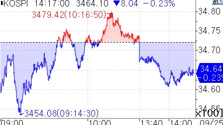 25일 코스피는 전 거래일보다 1.03포인트(0.03%) 내린 3,471.11에 거래를 마쳤다.