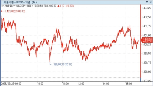 25일 서울 외환시장에서 달러-원 환율은 오후 3시 30분 기준 전장대비 3.10원 오른 1,400.60원을 기록했다. 정규거래 종가를 기준으로 지난 8월 1일(1,401.40원) 이후 가장 높은 수준이다.
