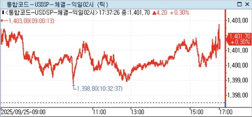 25일 서울 외환시장에서 달러-원 환율은 오후 5시 30분 현재 전일대비 3.80원 오른 1,401.30원에 거래됐다.