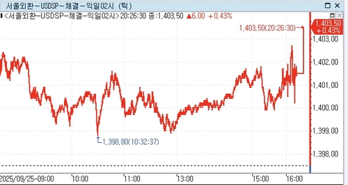 25일 서울 외환시장에서 달러-원 환율은 오후 8시 30분 현재 전일 대비 6.0원 오른 1,403.50원에 거래됐다.
