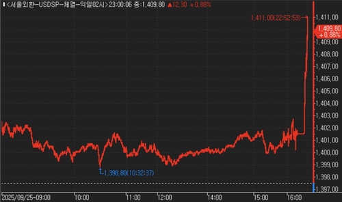 25일 서울 외환시장에서 달러-원 환율은 오후 11시 현재 전일 대비 12.30원 오른 1,409.00원에 거래됐다.