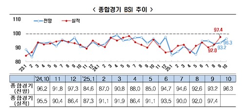 제조업 BSI는 96.8, 비제조업 BSI는 95.8을 기록하는 등 모두 기준선 100을 하회했다.