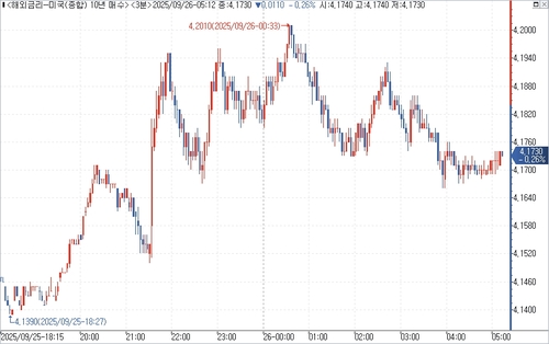 연합인포맥스의 해외금리 일중 화면(화면번호 6532)에 따르면 25일(미국 동부시간) 오후 3시 현재 뉴욕 채권시장에서 10년물 국채금리는 전 거래일 오후 3시 기준가 대비 2.70bp 오른 4.1740%에 거래됐다.