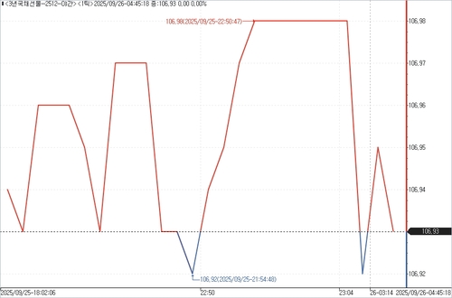 26일 서울채권시장에 따르면 3년 국채선물은 야간 거래에서 전일 주간 거래 종가 대비 5틱 하락한 106.93에 마감됐다. 외국인은 244계약 순매수했고, 개인과 금융투자는 각각 34계약 및 210계약 순매도했다.