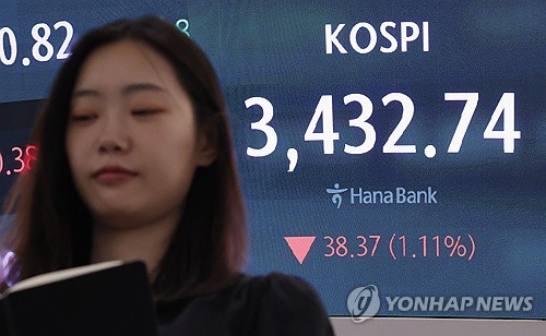 26일 연합인포맥스 신주식종합(화면번호 3536)에 따르면 오전 9시 51분 기준 코스피는 전 거래일보다 56.06포인트(1.62%) 빠진 3,415.05이다.