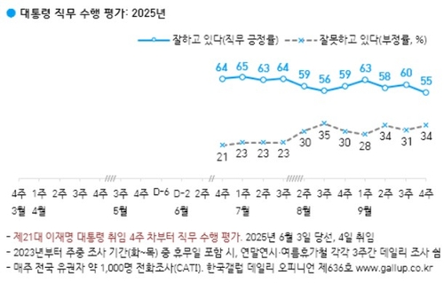 (서울=연합인포맥스) 온다예 기자 = 이재명 대통령의 국정 지지율이 55%로 하락했다는 여론조사 결과가 26일 나왔다.