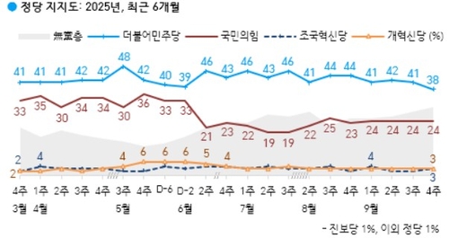 정당 지지도는 더불어민주당이 전주(41%)보다 3%p 내린 38%를 기록했고 국민의힘은 전주와 같은 24%를 유지했다.