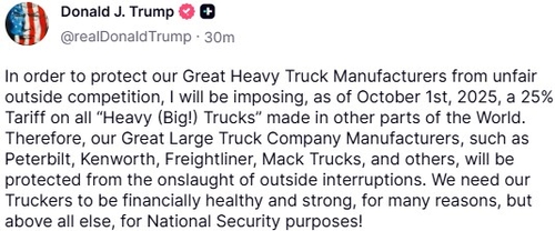 25일(현지시간) 트럼프 대통령은 자신의 소셜미디어 트루스소셜에 "우리의 대형트럭 제조업체들을 불공정한 외부 경쟁으로부터 보호하기 위해 2025년 10월 1일부터 세계 다른 지역에서 생산되는 모든 대형트럭에 25%의 관세를 부과할 것"이라고 밝혔다.