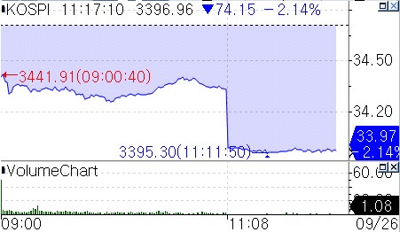 26일 연합인포맥스 신주식종합(화면번호 3536)에 따르면 오전 11시 17분 기준으로 코스피가 전 거래일보다 74.15포인트(2.14%) 하락한 3,396.96을 나타냈다. 코스피가 장중 3,400선을 하회한 것은 지난 15일 이후 처음이다. 코스피는 지난 24일 장중 3,497.95까지 오르며 3,500선을 넘봤고, 전날에는 3,471.11로 마감했다.