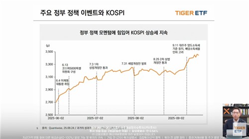 세미나를 진행한 정의현 미래에셋 ETF운용본부장은 연초 이후 코스피가 주요한 정책 이벤트 흐름에 맞춰 우상향했다고 분석했다. 지난 1차·2차 상법 개정에 이어 일관된 자본시장 개혁 기조가 정책 수혜 종목의 견조한 흐름을 이끌었다고 봤다.