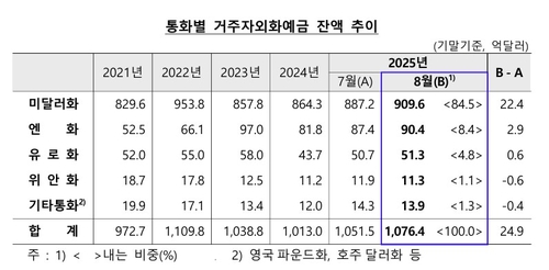 26일 한국은행에 따르면 지난 8월 말 현재 외국환은행의 거주자 외화예금은 전달보다 24억9천만달러 증가한 1천76억4천만달러로 집계됐다.