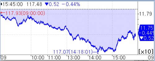 10년 국채선물은 52틱 급락한 117.48이었다. 외국인은 1만2천290계약 팔았고 증권은 7천814계약 사들였다.