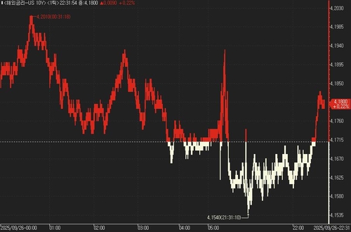 연합인포맥스의 해외금리 일중 화면(화면번호 6532)에 따르면 26일(미국 동부시간) 오전 9시 현재 뉴욕 채권시장에서 10년물 국채금리는 전 거래일 오후 3시 기준가보다 1.30bp 하락한 4.161%를 기록했다.
