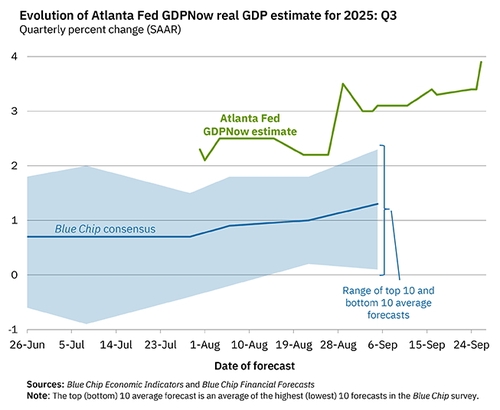 GDP 나우의 3분기 전망치는 지난달 하순 2.2%까지 하락한 뒤 다시 반등하는 흐름을 보여왔다. 실제 3.9% 성장을 하게 되면 지난 2023년 3분기(4.7%) 이후 최고치를 기록하게 된다.