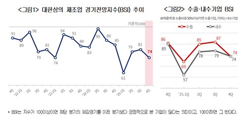 대한상공회의소는 전국 제조기업 2천275개 사를 대상으로 조사한 '2025년 4분기 기업경기전망지수(BSI)'가 74로 집계됐다고 28일 밝혔다. 3분기 전망치보다 7포인트(p), 작년 4분기에 비해서는 11p 하락한 수치다.