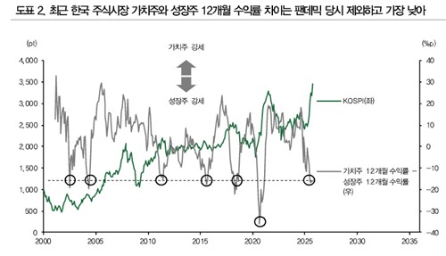강 연구원은 해당 수준이 팬데믹 당시를 제외하면 가장 낮은 수준이라며 "한국 주식시장에서 스타일의 쏠림이 경계에 이르렀다"고 말했다.