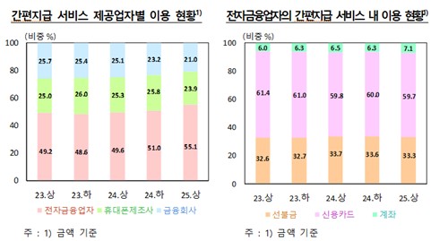 간편지급 서비스 제공자별로 보면 전자금융업자의 비중이 55.1%로 가장 컸다. 이 비중은 지난해 상반기 49.6%, 지난해 하반기 51.0%에서 지속적으로 확대되고 있다.