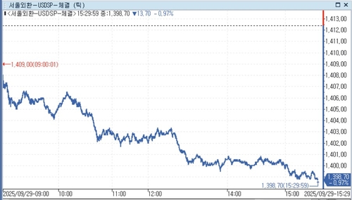 29일 서울 외환시장에서 달러-원 환율은 오후 3시 30분 기준 전장대비 13.70원 내린 1,398.70원을 기록했다.