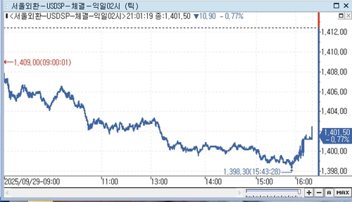 29일 외환시장에서 달러-원 환율은 오후 9시 6분 현재 전 거래일 대비 1,401.50원에 거래됐다.