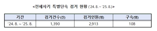 국토교통부와 대검찰청, 경찰청은 2024년 8월부터 올해 8월까지 전세사기 특별 단속을 통해 2천913명을 검거하고 108명을 구속했다고 30일 밝혔다.