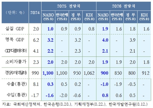 국회예산정책처(예정처)는 30일 발간한 '2026년 NABO 경제전망: 2025~2029'을 통해 올해 우리나라 실질 GDP 성장률은 1.0%, 2026년은 1.9%로 전망했다.
