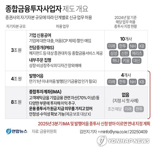 IMA는 자기자본 8조원 이상의 종합금융투자사업자에게 허용되는 제도로, 고객 자금을 온라인카지노 알파벳사가 통합 운용해 수익을 나누도록 했다. 레버리지 한도도 300%로 가장 넓다. 자기자본 요건 8조원을 고려했을 때, IMA를 통해 총 24조원까지 조달 여력을 늘릴 수 있다.