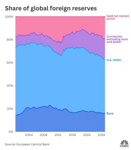 유럽중앙은행(ECB)에 따르면 글로벌 외환보유고에서 금이 차지하는 비중은 지난 2018년 11% 수준에서 작년 20% 수준으로 늘어난 반면, 달러 비중은 같은 기간 약 55%에서 46%로 줄어들었다. 금은 유로화를 제치고 세계 2위의 준비자산으로 등극하기도 했다.