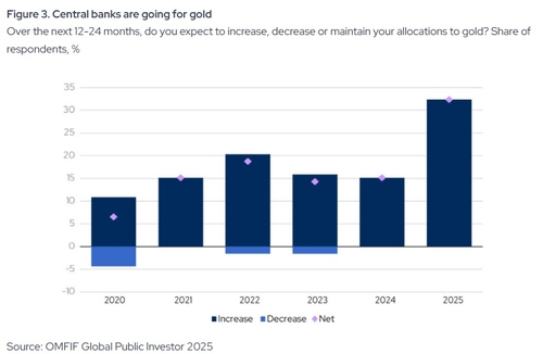 국제 싱크탱크 공적통화금융포럼(OMFIF)이 75개의 중앙은행을 대상으로 실시한 최근 설문 조사를 보면 약 30%의 응답자가 향후 12~24개월 동안 금 투자를 늘릴 계획이라고 밝혔다. 이는 작년 15%에서 크게 늘어난 수치다.